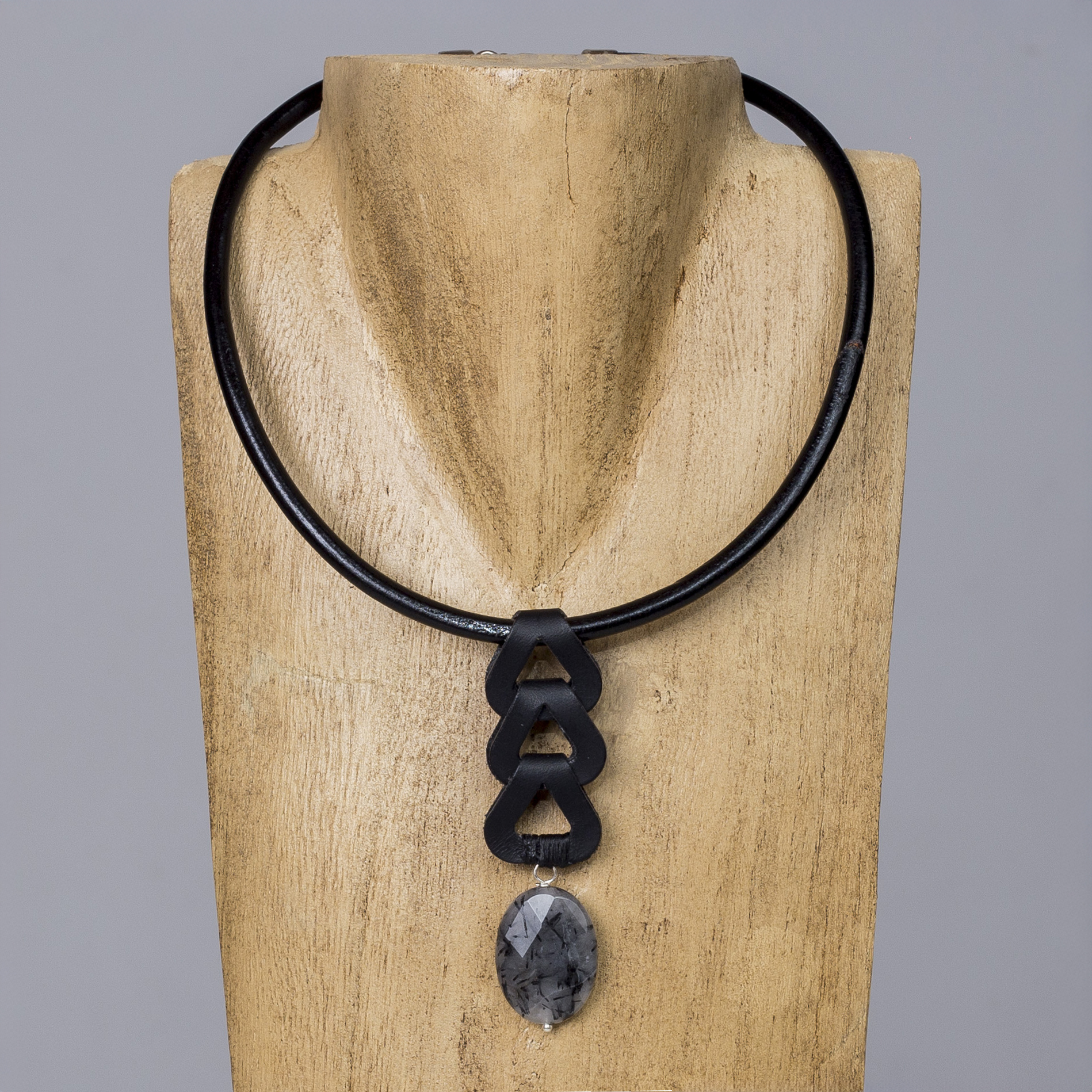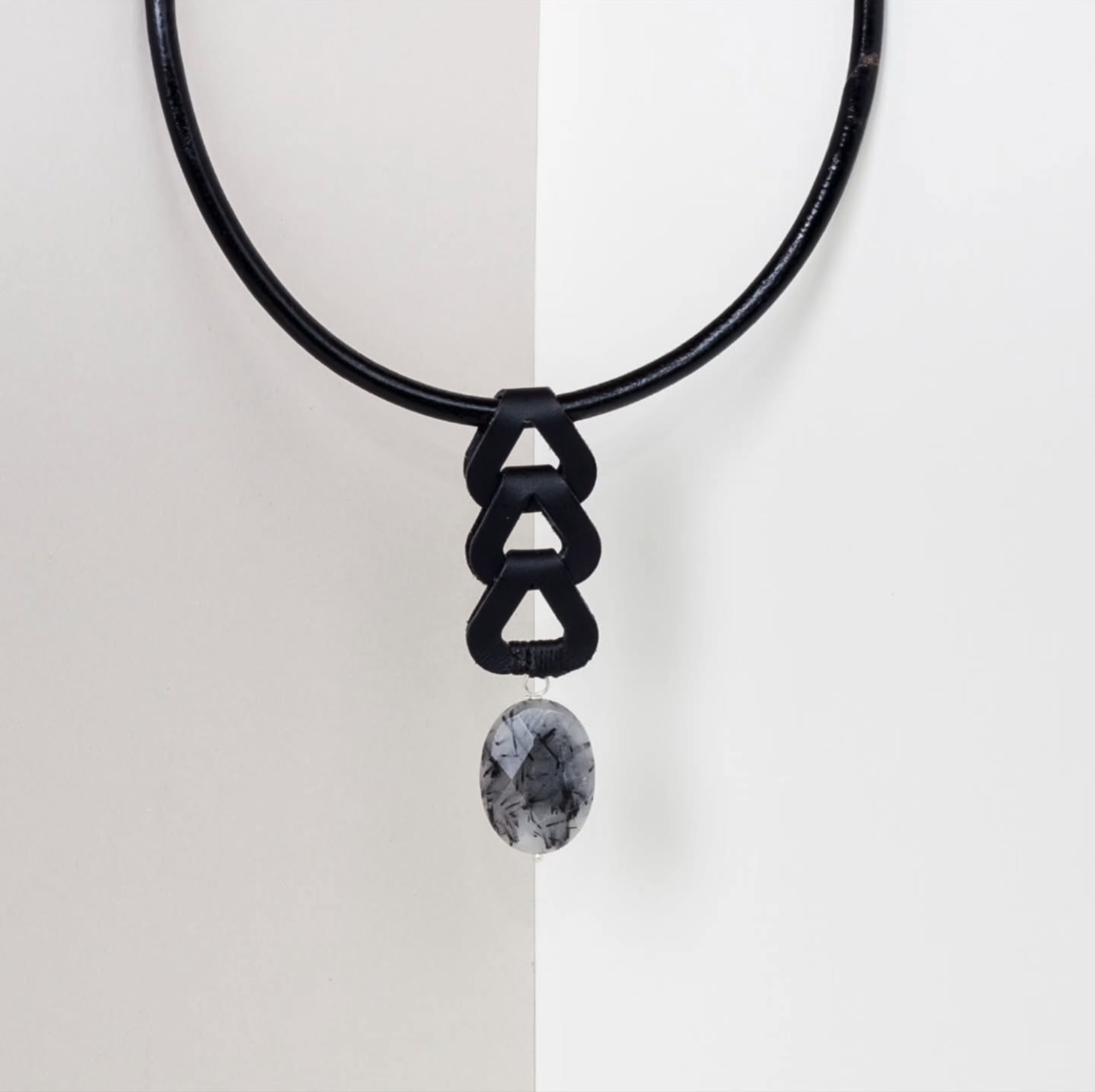 Collar rígido de cuero negro con motivo central de tres piezas geométricas y colgante de cuarzo turmalinado facetado. Ligero, cómodo y con un punto natural que eleva cualquier look.