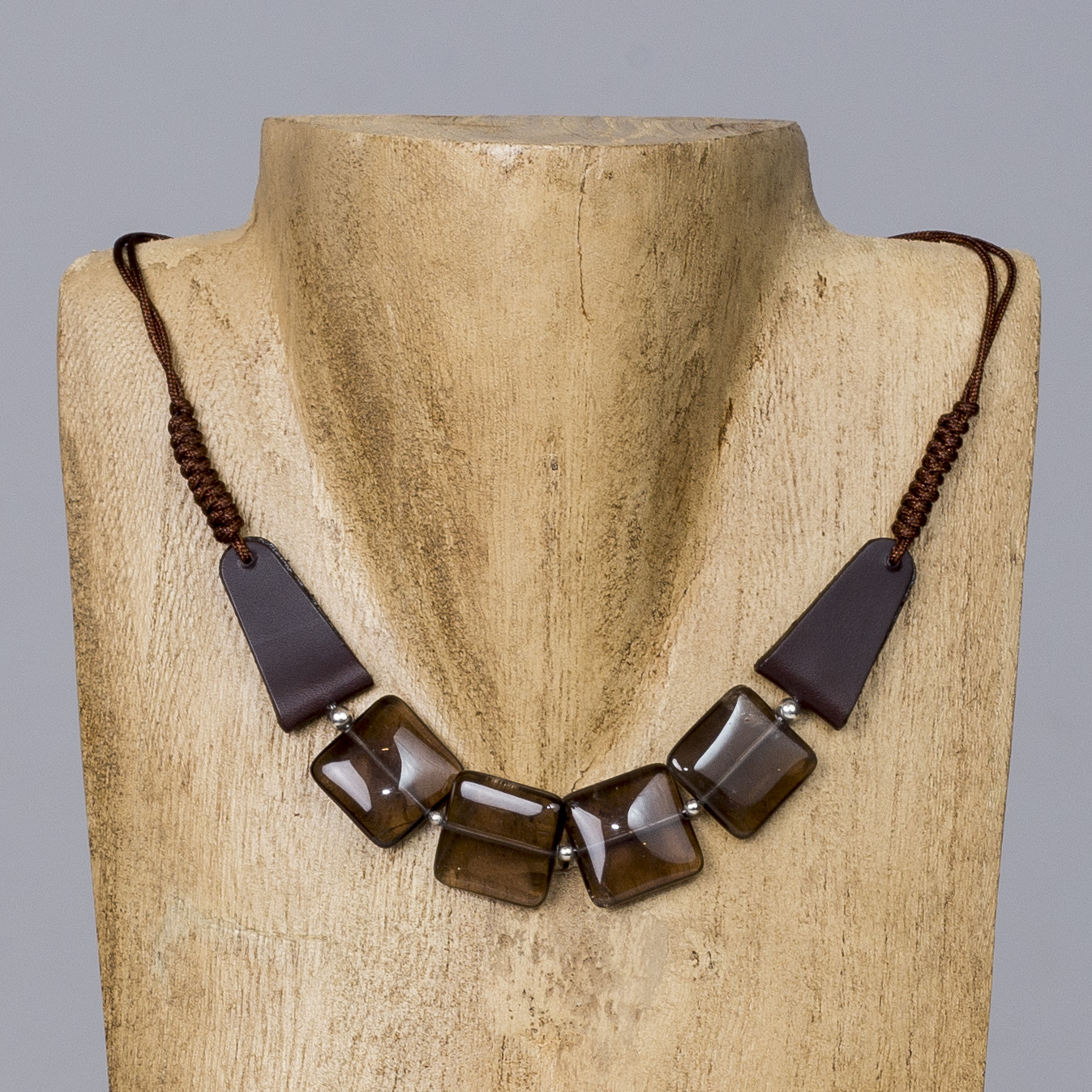 Collar artesanal con terminales de cuero marrón y frente de piedras naturales cuadradas de brillo translúcido en tonos ahumados. Cordón con detalle trenzado y largo regulable. Elegante, ligero y muy combinable.