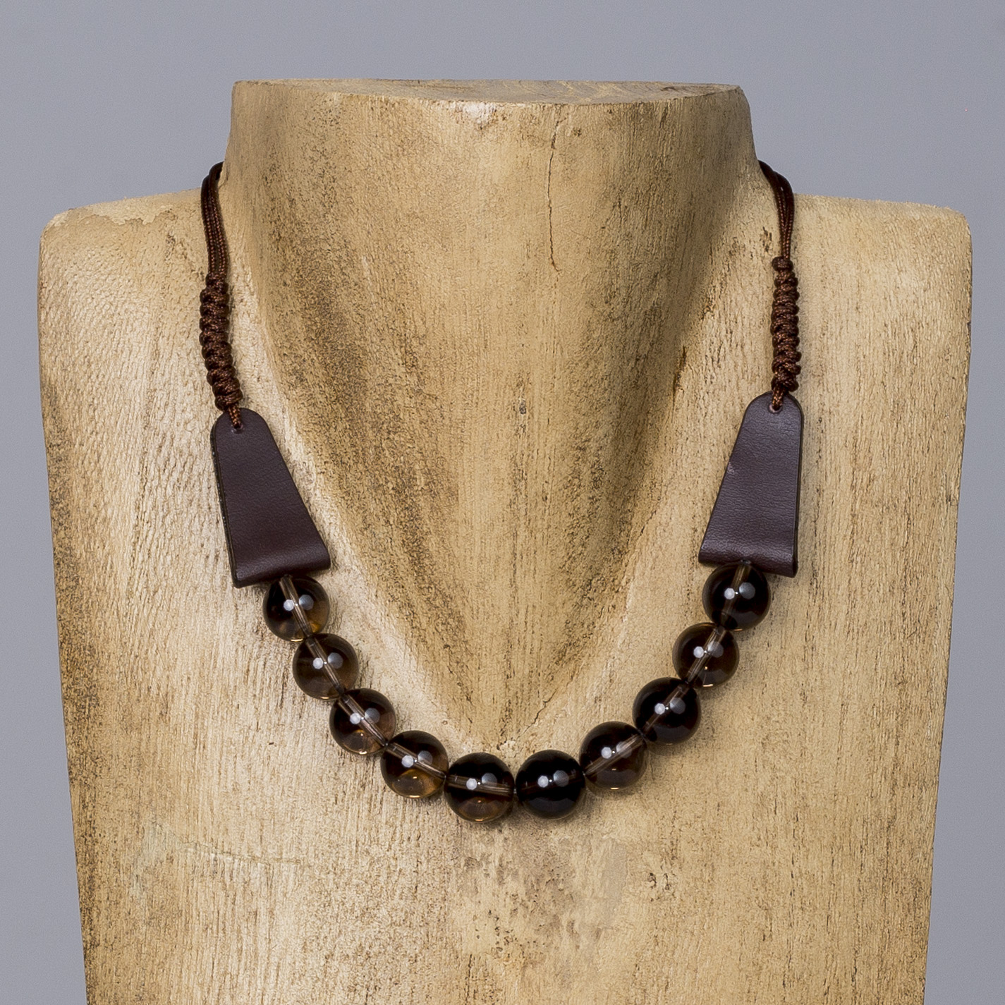 Materiales: cuero marrón; piedras naturales pulidas (tonalidades ámbar/ahumadas); cordón textil y herrajes metálicos.