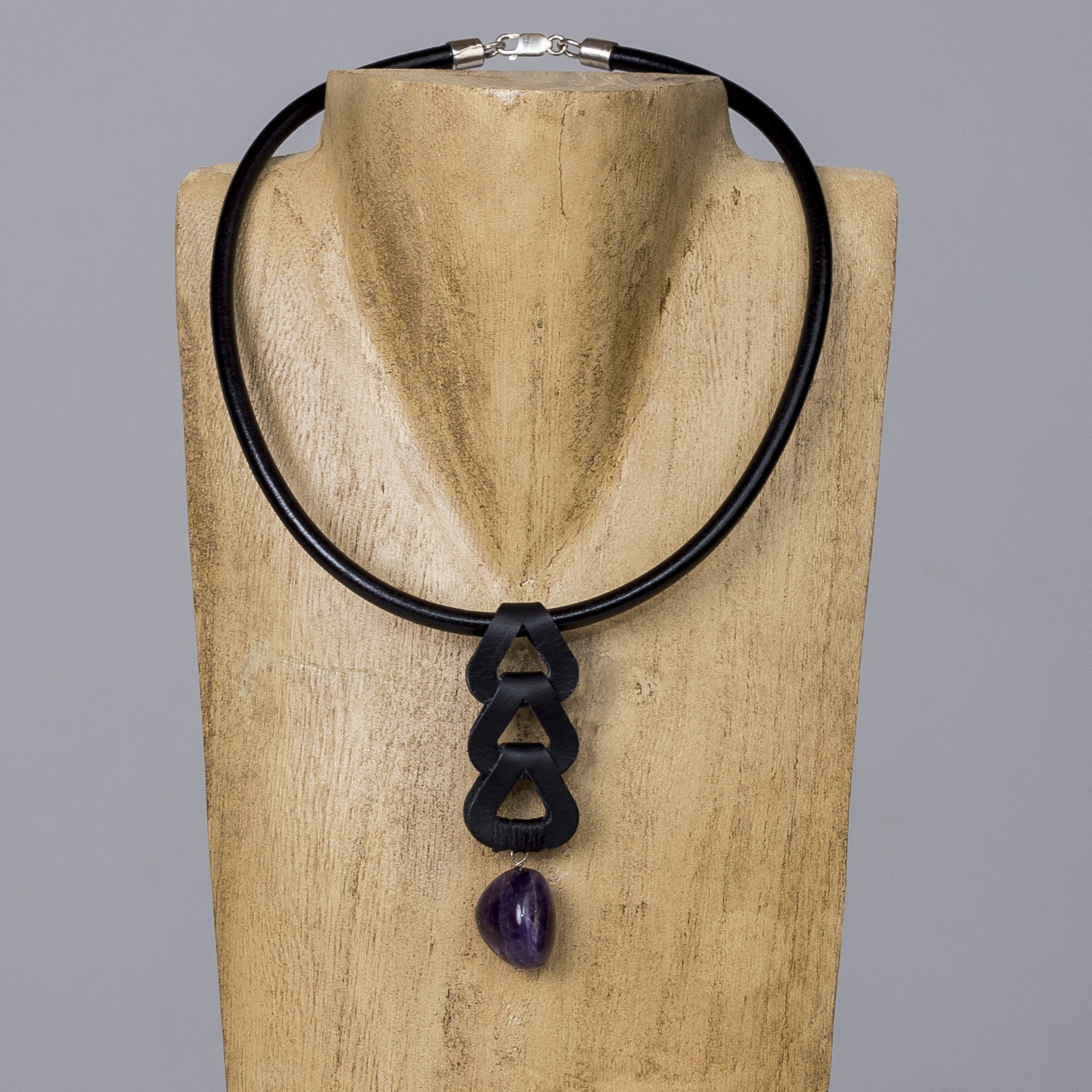 Collar rígido de cuero negro con motivo central de tres piezas geométricas y colgante de amatista natural. Ligero, elegante y con el inconfundible violeta de la amatista —piedra vinculada a la calma y la claridad.