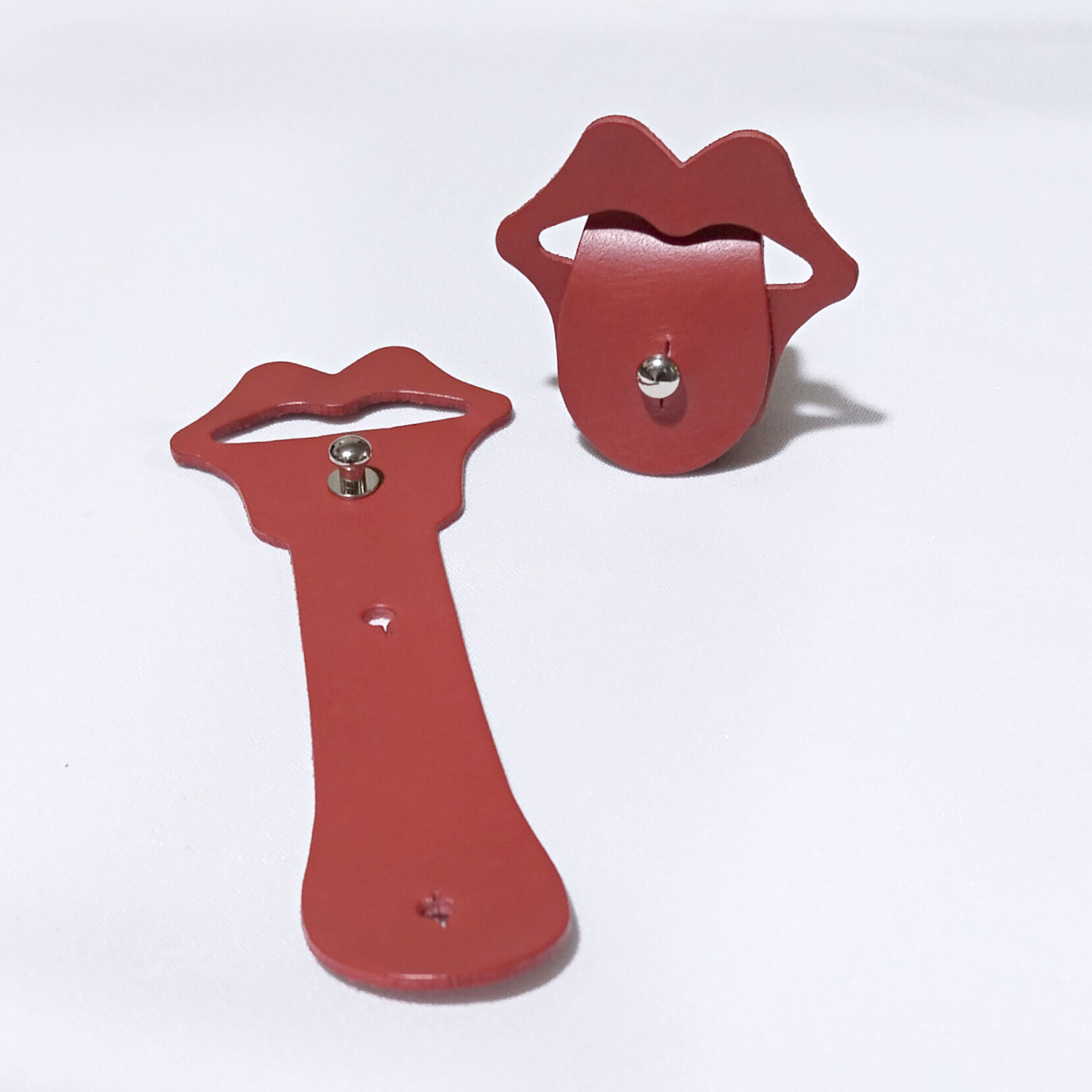 Organizador de cables hecho a mano en cuero rojo inspirado en la mítica lengua rock. Cierra con broche metálico para sujetar auriculares, cargadores o cables USB. Compacto, divertido y ultra resistente.