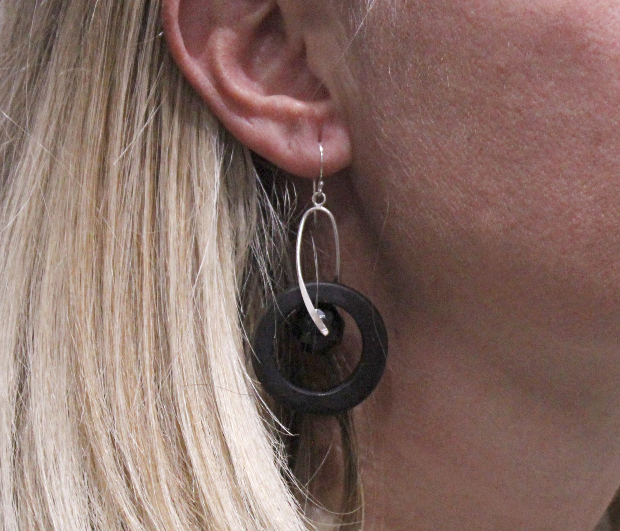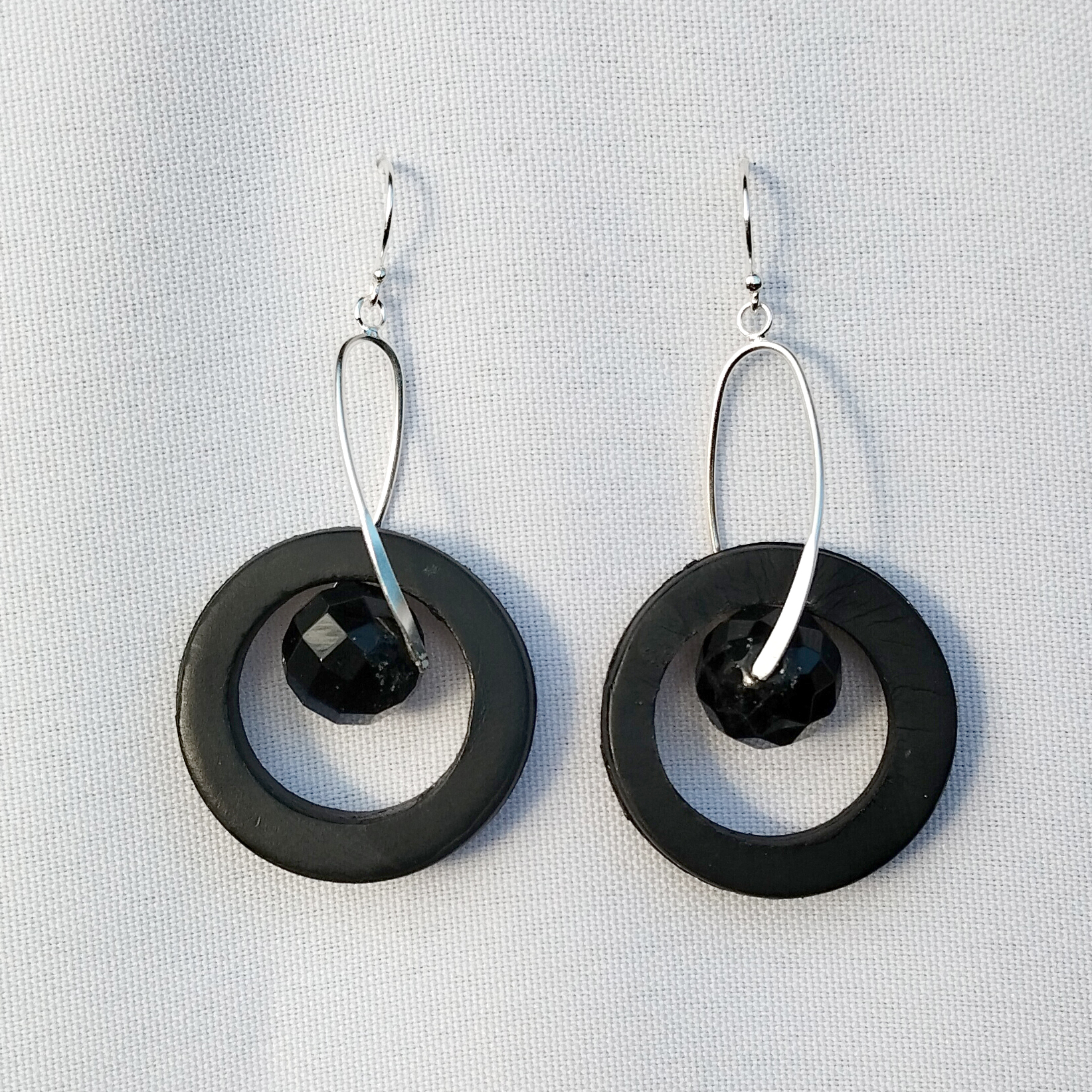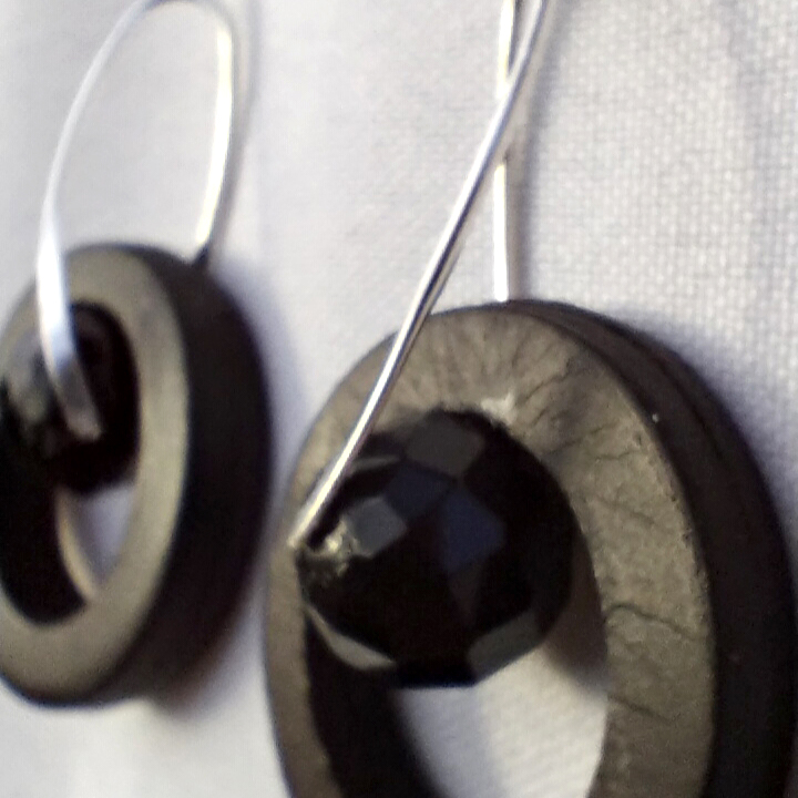 Materiales: aro de cuero; hilo/gancho y detalle en plata; bola facetada (tono negro).